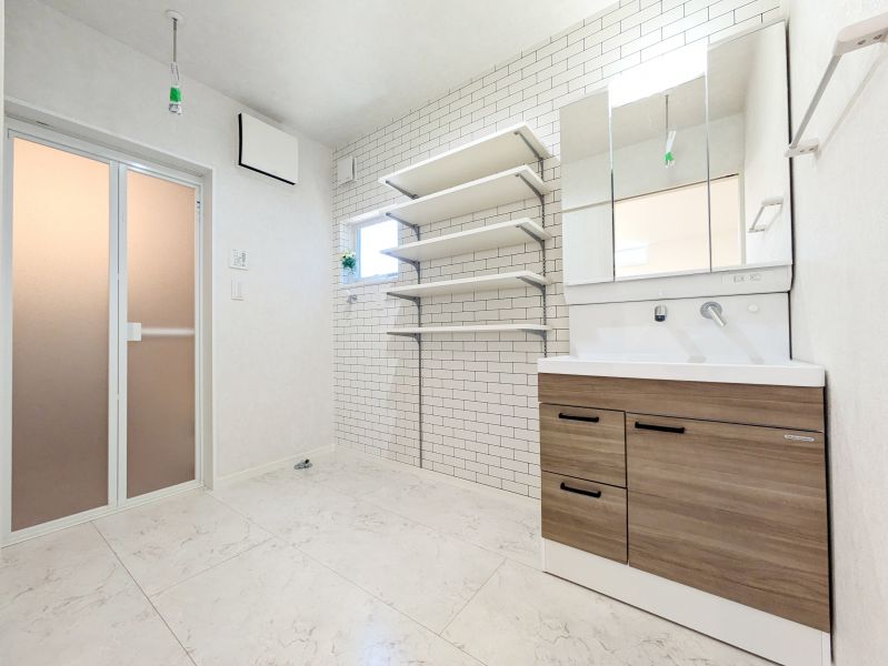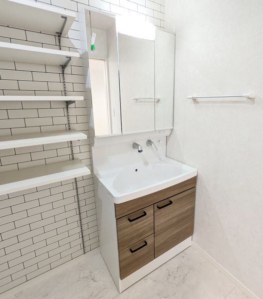 使いやすいシンプルなデザインの三面鏡洗面台。身支度時にうれしい機能性や収納力もしっかりと備えてます。