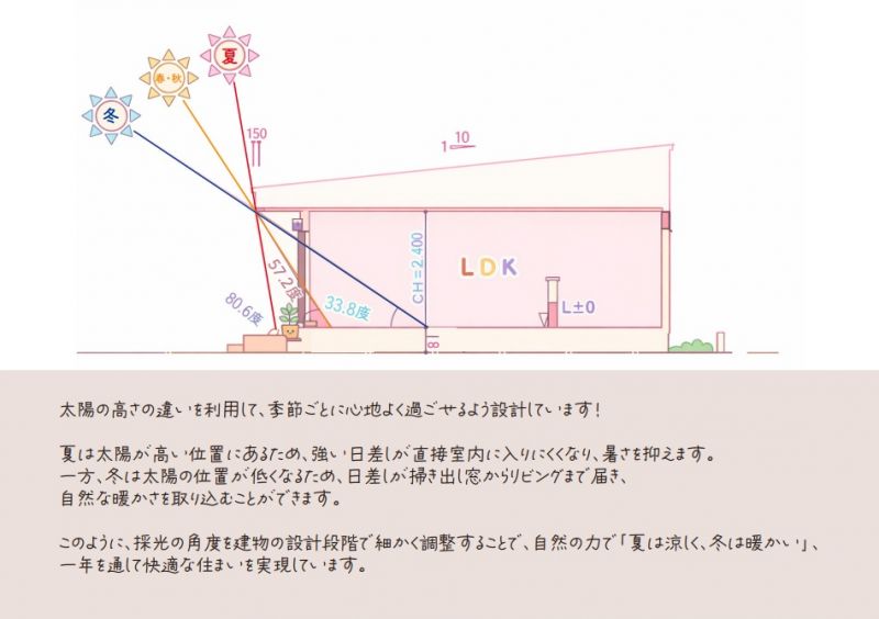 太陽の高さに合わせ採光角度を計算した設計で、夏は涼しく冬は暖かい快適な平屋です。キッチン横の冷凍庫も置ける2WAY収納や広々3畳の洗面室など、家事ラクと充実の収納でスッキリ暮らせる工夫が満載です。