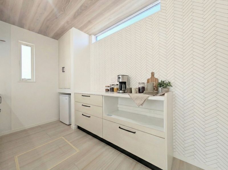 ※扉付き収納下のスペースに冷凍庫をイメージしてみました!(家電・備品等はイメージです。) まとめ買いや作り置きに便利なセカンド冷凍庫も、キッチン周りにすっきり収まり、毎日の家事効率がさらに高まります。