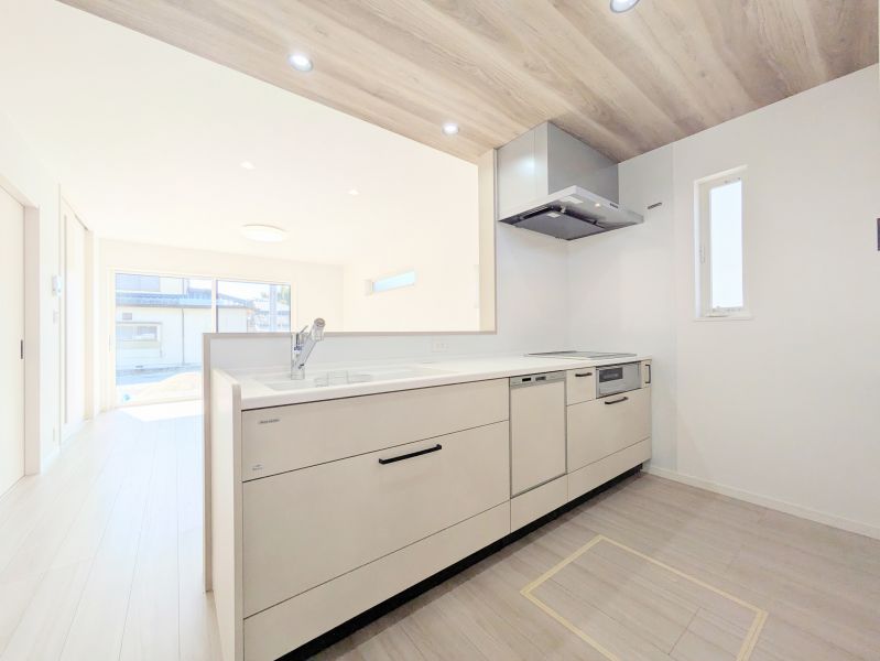 キッチンから見たリビング:対面キッチンを採用することで、お料理中も、お子様やご家族の様子を見ることができます♪