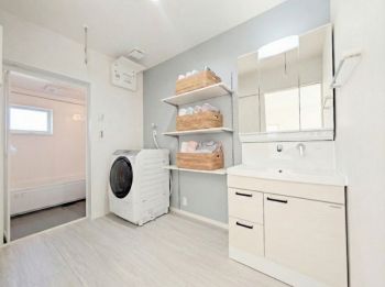 ※洗面室に洗濯機と、壁付けの棚にかご収納をイメージしてみました♪(家電・備品等はイメージです。) タオルや洗剤のストックなどをしまうために別途棚を用意する必要がなく、すっきり片付きます♪