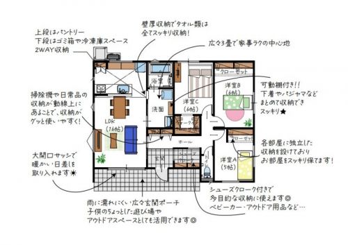 キッチン横の2WAY収納はパントリーや冷凍庫置場に最適。広々3畳の洗面室や各室収納、シューズクロークなど、家事ラクと整理整頓を叶える工夫が満載。大開口サッシからの光が心地よい住まい。