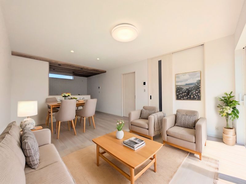 キッチンから見たリビング:対面キッチンを採用することで、お料理中も、お子様やご家族の様子を見ることができます♪