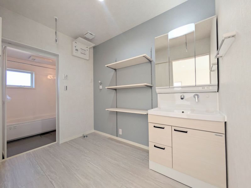 洗面脱衣所:使いやすいシンプルなデザインの三面鏡洗面台。身支度時にうれしい機能性や収納力もしっかりと備えてます。