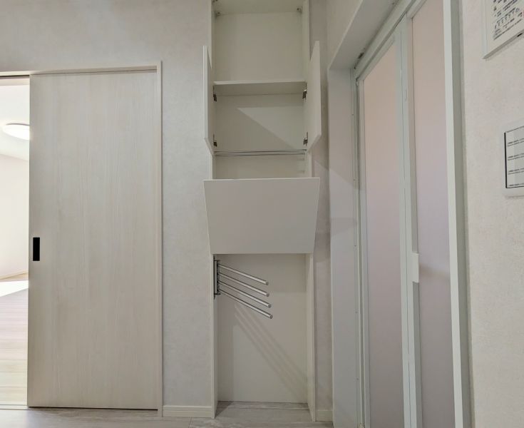 洗面脱衣所:折り畳み式の収納もあります!タオル置き・タオル干し・小物収納など活用方法は多岐にわたります!