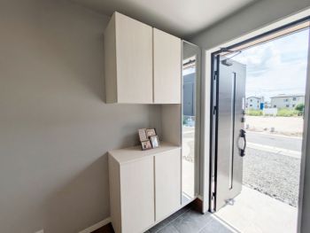 玄関にはシューズボックスを完備。家族分の靴をまとめて収納できるので、靴が散らからず、毎日の出入りもスムーズです♪
