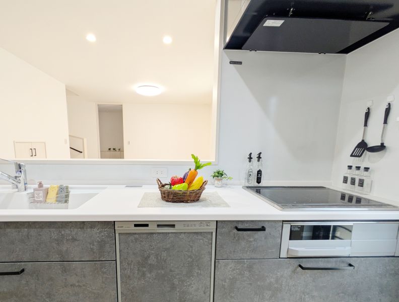【1階 LDK】 料理しながらリビング全体が見渡せる対面キッチンのLDK。