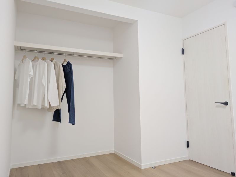 【クローゼット】 洋室のクローゼットは、扉が無い「オープンクローゼット」タイプです。扉が無い分、換気もしっかりとでき、お部屋のアレンジもしやすく、開放的で有意義に生活が出来ます♪