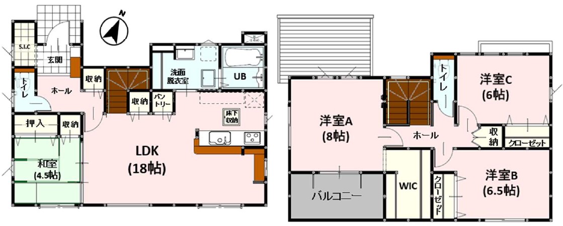 1階は18帖のLDKと4.5帖の和室!キッチンにはパントリー付き♪リビングには収納あり♪『続き間の和室』は子育て世代にこそ適しています。 お子様のお昼寝スペースや、洗濯物をたたむのに便利です。 客間やリビングの延長としても使えます。 2階の洋室にはW.I.C完備!生活空間をスッキリさせることができます!