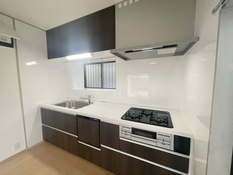 【キッチン】新品に交換済みのシステムキッチンは、時短を叶える食洗機と3口コンロを完備。収納も豊富で、機能性と美しさを両立した空間が、毎日の料理をより楽しく快適にします。