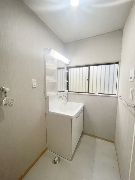 【洗面脱衣室】窓付きの洗面脱衣室は、自然光が差し込み明るく清潔感のある空間です。湿気がこもりやすい場所ですが、スムーズに換気ができるため、カビの発生を抑え快適さを保てます。