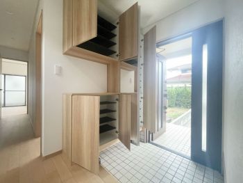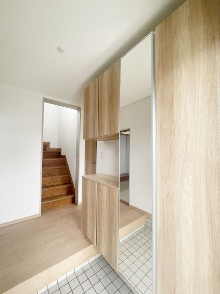 【玄関】大容量のシューズボックスは、家族全員の靴をスッキリ収納可能。便利な姿見付きで、お出かけ前の身だしなみチェックもスムーズ。玄関を常に美しく整えられます。