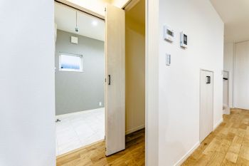 洗面脱衣室の先はファミリークローゼット♪その先に玄関ホールがあります。生活動線を考えた間取りです♪