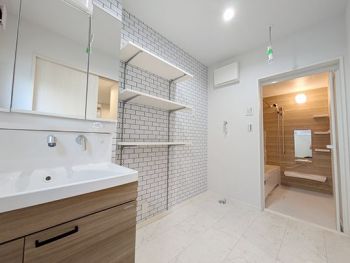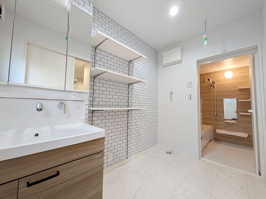 広い洗面脱衣室もポイントの一つです♪スタイリッシュな三面鏡洗面台も嬉しいですね♪