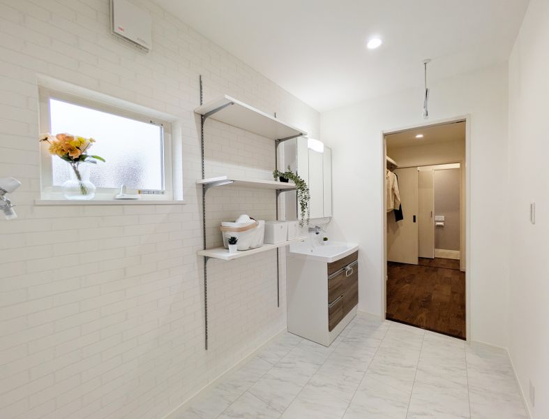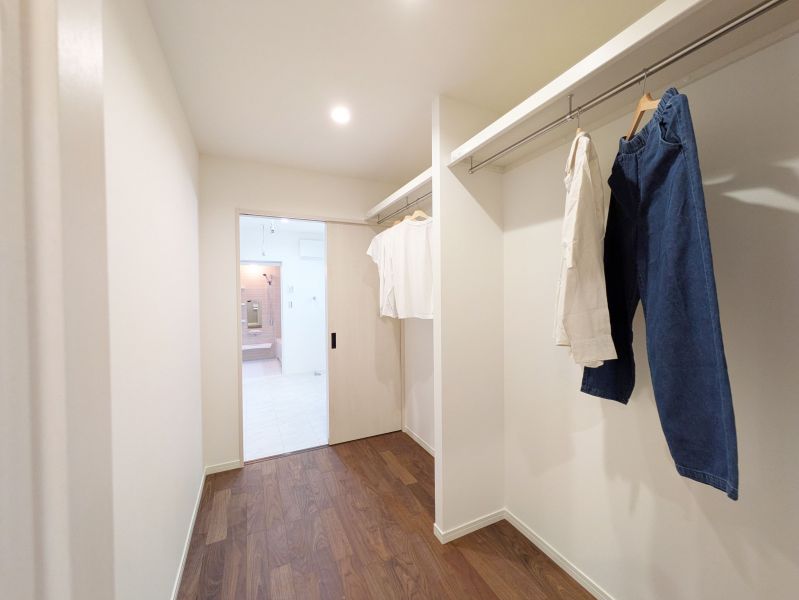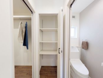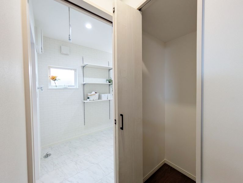 玄関ホールからウォークインクローゼットを通って、洗面脱衣室へ、その奥に浴室があります。洗面脱衣室はリビングへ繋がっていて、家事動線がスムーズ♪