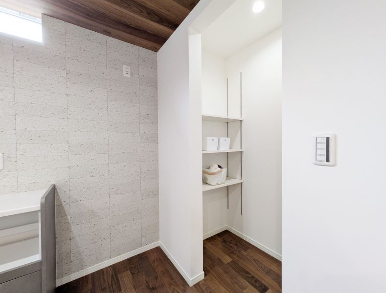 玄関奥に、日用品や掃除用具などをスッキリ収納できる扉付きの収納スペースを設けています。見た目をすっきり保ちながら、生活感が出やすいアイテムも隠せるので、来客時も安心です。