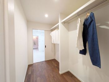 主寝室のウォークインクローゼットには、普段のお洋服だけでなく季節物の荷物も収納できます。シワをつけたくない洋服も立てかけて収納可能です。