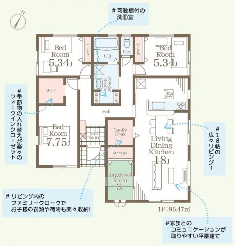 合志小学校まで徒歩約14分♪来客時も安心の4台駐車可能! 家族とのコミュニケーションが取りやすい29坪4LDK平屋建。 18帖の広々リビング。リビング横に3帖の和室あり。 リビング内にファミリークロークがあり、ご家族の衣類や荷物も楽々収納! 7.75帖洋室にはW.I.Cがあり、季節物の入れ替えが楽々♪ 全3棟販売!