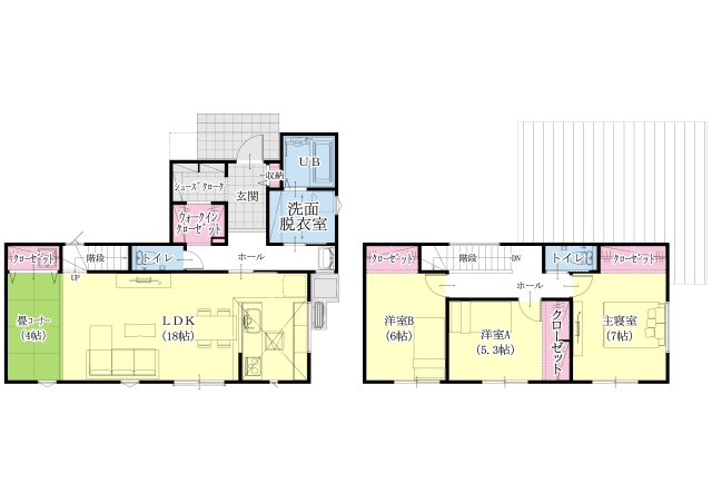 間取り|18帖の広々LDK。シューズクロークとウォークインクローゼットがあるので、帰宅動線もgoodです!和室もあるので、ゆっくりくつろげます♪