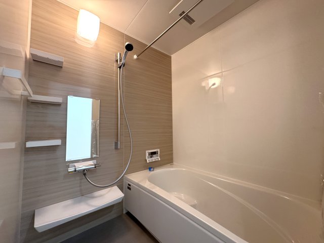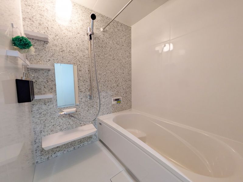 【お風呂】ホーロー加工された1616サイズの浴室。傷がつきにくく、汚れも落ちやすく、キレイが長続きします。浮かせる収納もでき、ヌメリを軽減できます◎