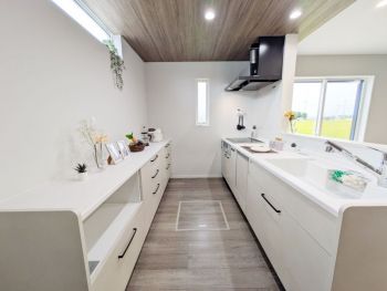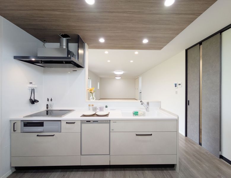 キッチン(同仕様画像)|IHを採用。フラットで汚れがたまりにくく、炎がないから換気や油汚れも少なめ。火災リスクが低く、空気もクリーン。 小さなお子さまや高齢者がいるご家庭でも安心して使えます。