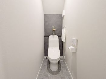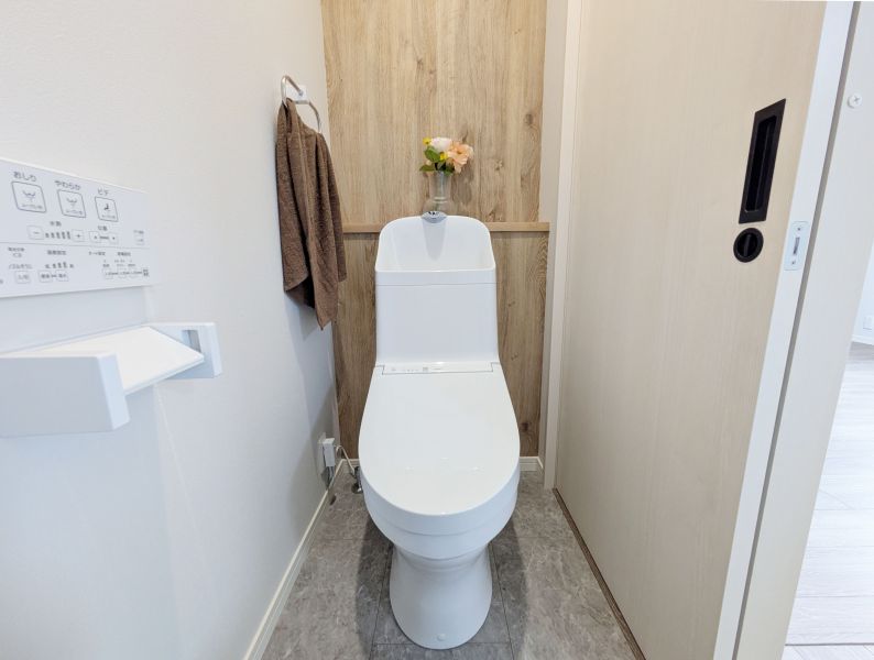 【2階トイレ】木目調のアクセントクロスで、お洒落な空間です◎