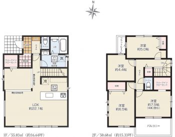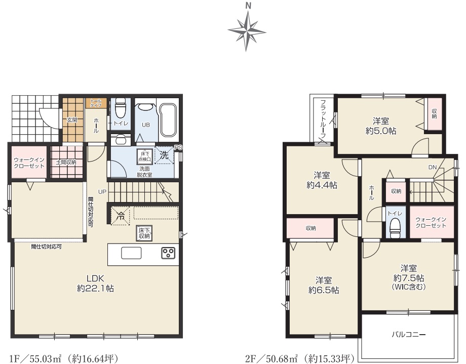 1階 22.1帖LDK 間仕切り対応可スペースあり♪ W.I.Cを配置♪ 床下収納あり♪