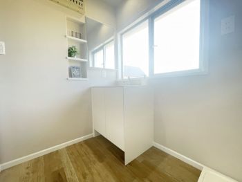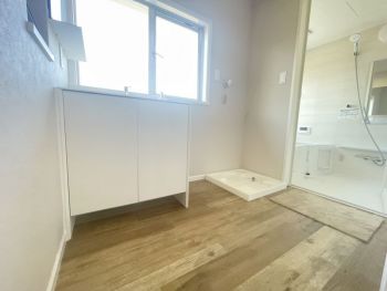洗面台横にランドリーコーナーもゆったり♪ドラム式洗濯機も置ける余裕♪
