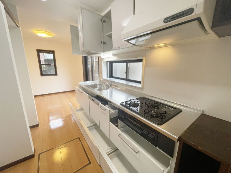 【キッチン】新品交換済みのシステムキッチンは、食洗機完備で家事効率アップ!足元まで開くスライド収納は出し入れもスムーズです。お掃除しやすい3口コンロも嬉しいポイント。