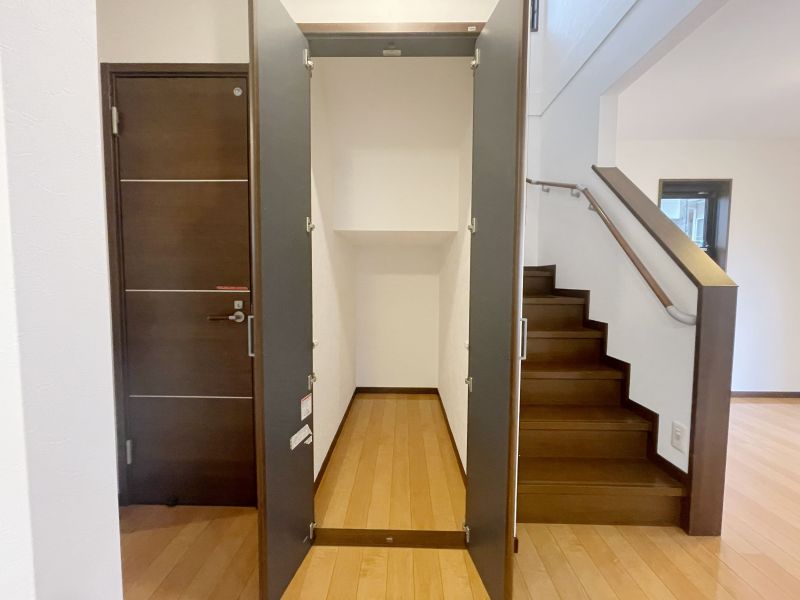 【物入】 階段横に配置された便利な1階収納。掃除道具や日用品のストックなど、リビングで使う物をサッと出し入れできます。お部屋の綺麗を保つための心強い味方です。