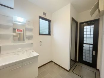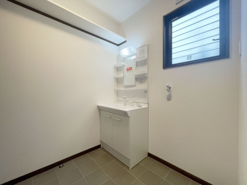 【洗面脱衣室】3帖のゆとりある洗面脱衣室には、タオルや着替えを整理できる物入を完備。広々とした空間で、朝の支度や入浴後の着替えもスムーズに行える機能的な設計です。