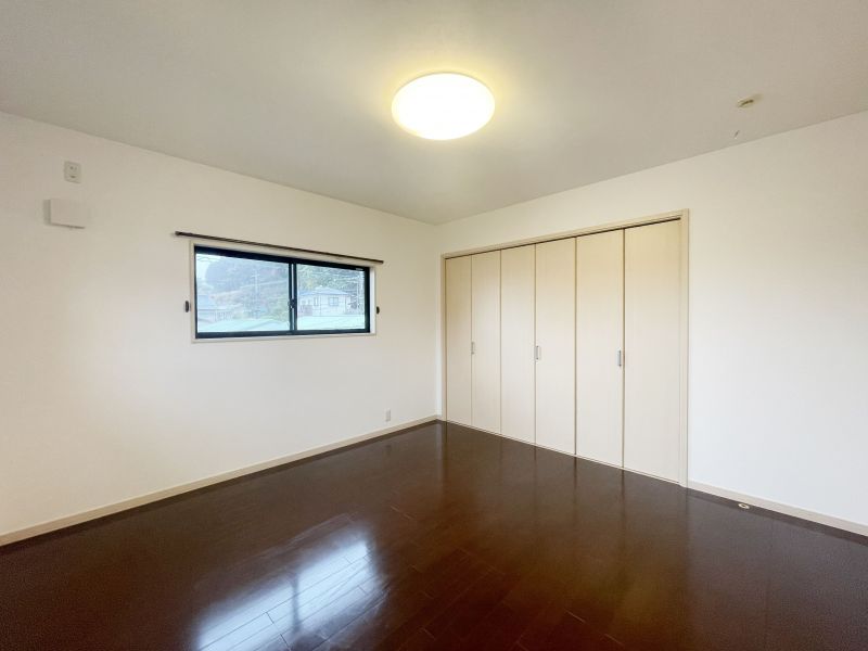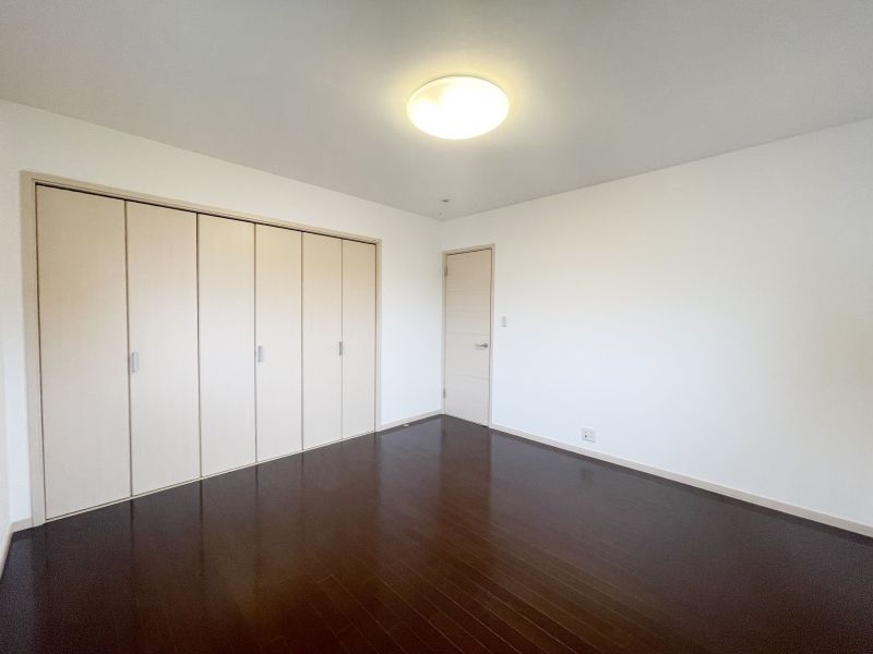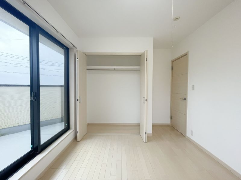 【洋室】2階8帖の広々とした洋室には、壁一面の大容量クローゼットを完備。衣類から季節物までスッキリ収まり、お部屋を広く使えます。主寝室にも最適な落ち着く空間です。