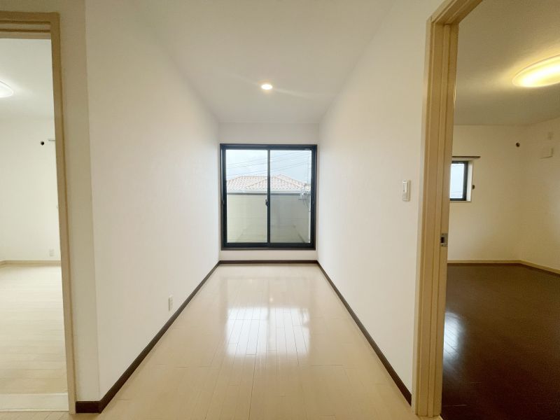 【2階ホール】バルコニーへ繋がる2階ホールは、明るい光が差し込む開放的な空間。洗濯物の取り込みがスムーズなだけでなく、椅子を置いてお気に入りの読書スペースにするのも素敵です。
