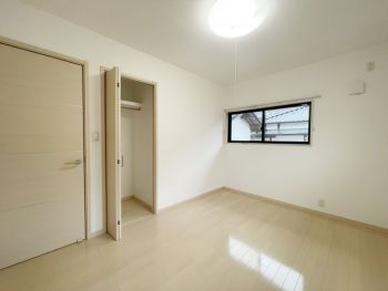 【洋室】朝日がやさしく差し込む明るい2階8帖洋室。心地よい目覚めを叶える健やかな空間です。大容量クローゼット付きで、衣類もスッキリ整理できます。