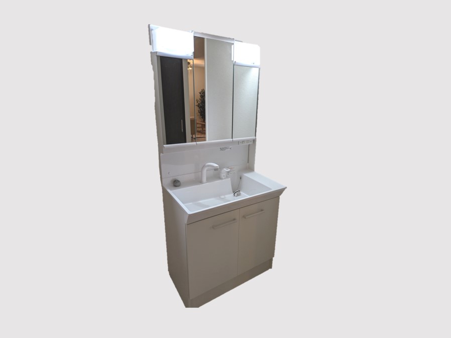 お手入れしやすく使いやすい3面鏡付きの洗面台。収納スペースも広く、洗剤や掃除道具をたっぷりと収納可。※同仕様画像