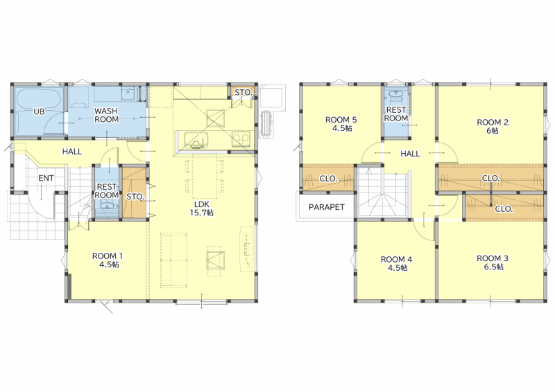 【1階 15.7帖LDK】※同仕様写真。 キッチンにはパントリーあり♪パントリーは、小物が多いキッチンに最適!扉付きで転倒防止になり、すっきり隠せます。