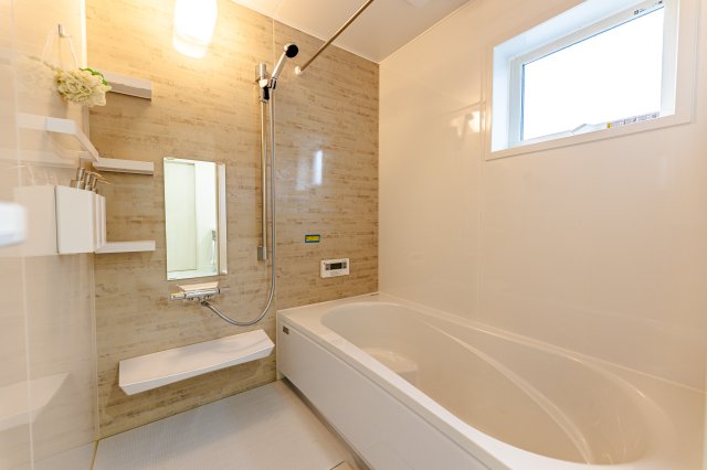 【浴室】※同仕様写真。 ホーロー加工された1616サイズの浴室。傷がつきにくく、汚れも落ちやすく、キレイが長続きします。金属の壁なのでマグネットアイテムで浮かせる収納♪