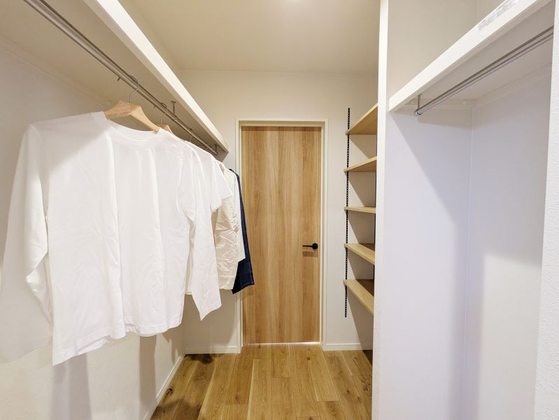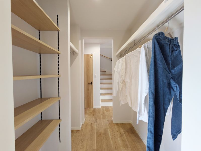 玄関ホールから直結のファミリーウォークインクローゼット。帰宅後すぐに上着や荷物を片付けられ、リビングに花粉や汚れを持ち込まない清潔な暮らしを叶えます。