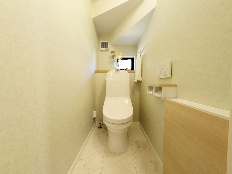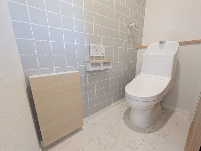 アクセントクロスが彩る収納付きです♪、こだわりの2階トイレ。空間をグッとおしゃれに演出し、毎日の生活に彩りを添えます。