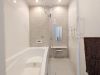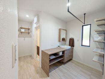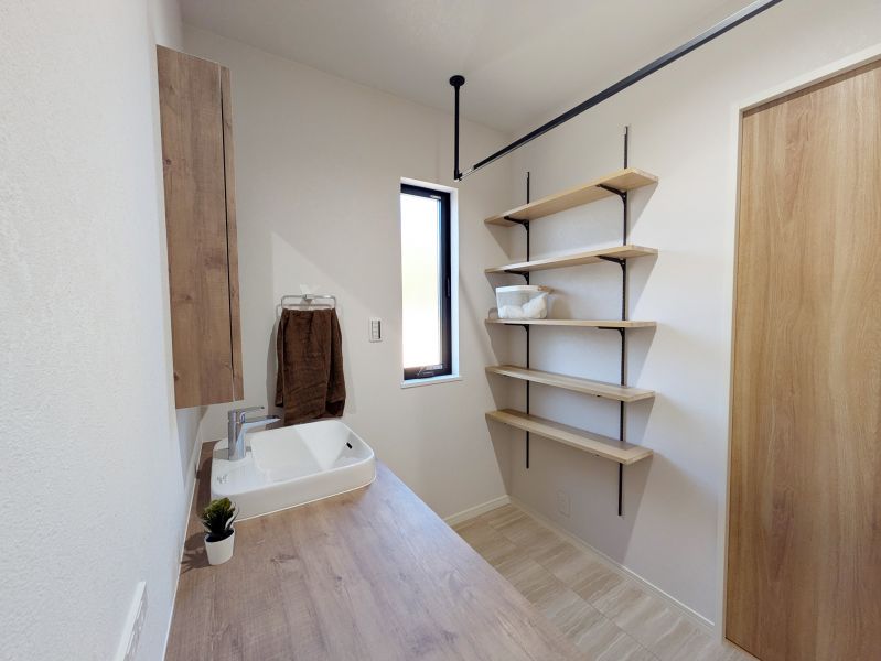 洗面室に便利な5段の壁付け棚を完備。家族全員のタオルや着替え、洗剤のストックまで、高さを活かしてスッキリ整理できます。