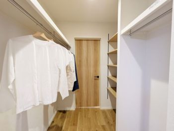 玄関とリビングを繋ぐファミリーウォークインクローゼット。帰宅後すぐに着替えや荷物を置ける「ただいま動線」が、リビングを常にスッキリと保ちます。