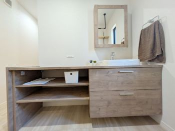 陶器製の洗面ボウルはシャープさと柔らかさをあわせもつデザイン。収納付の化粧鏡はぬくもりを感じる木目調。収納キャビネットはカウンター下のスペースを無駄なく活用できます。