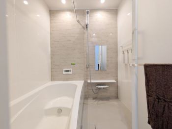 ホーロー加工された1616サイズの浴室。傷がつきにくく、汚れも落ちやすく、キレイが長続きします。金属の壁なのでマグネットアイテムで浮かせる収納♪