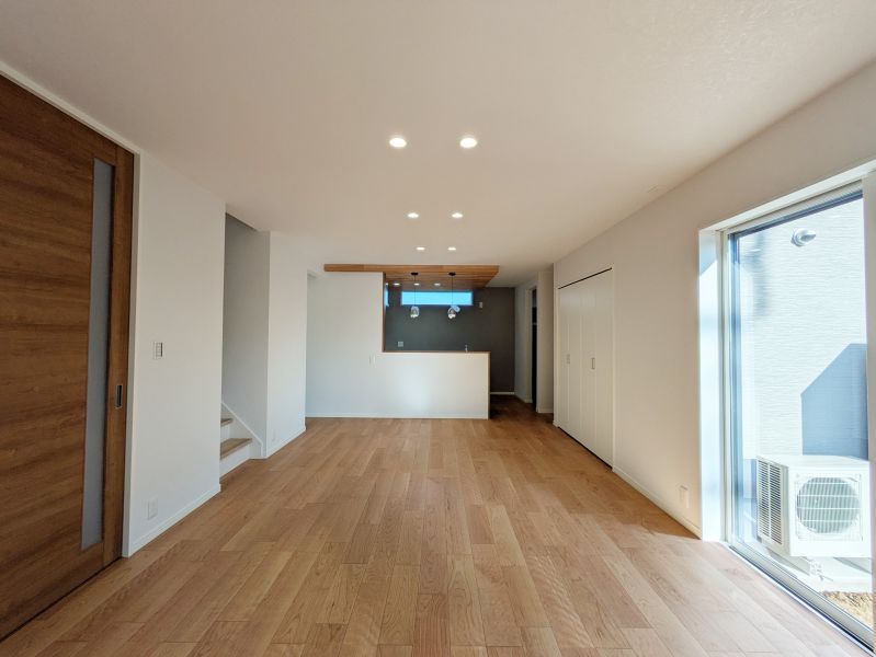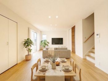 18.5帖の大空間を大きな窓が彩るLDK。リビング階段が家族の自然な交流を育み、開放感と温もりに満ちた暮らしを実現。