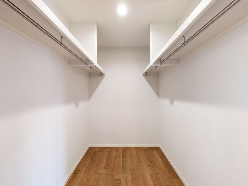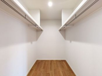 1階に配置した広々ファミリーウォークインクローゼット。家族全員の着替えや荷物を1箇所に集約でき、家事動線を短縮しながら家中をスッキリ保ちます。