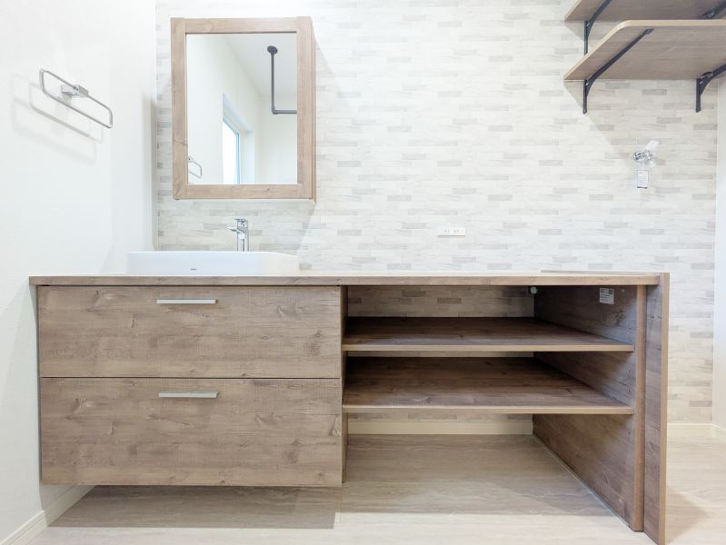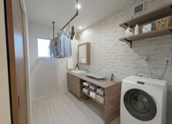 洗面脱衣室に内装をイメージしてみました♪アイアンバーで干し、広々カウンターで畳む・アイロンがけまで完結。壁付け棚も完備し「洗う・干す・整える」を1カ所で叶えます。 ※家電や備品等はイメージです。