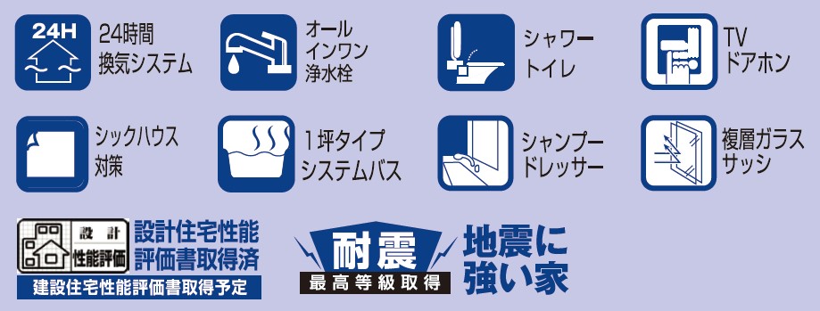 | 特徴 | 住宅性能保証付、オール電化、水道(公営),耐震構造,設計住宅性能評価書,建設住宅性能評価書(新築時),セットバック無 | ||
