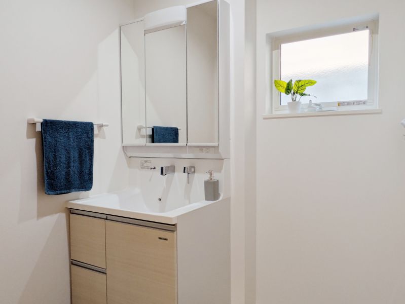 使いやすいシンプルなデザインの三面鏡洗面台。身支度時にうれしい機能性や収納力もしっかりと備えてます。