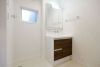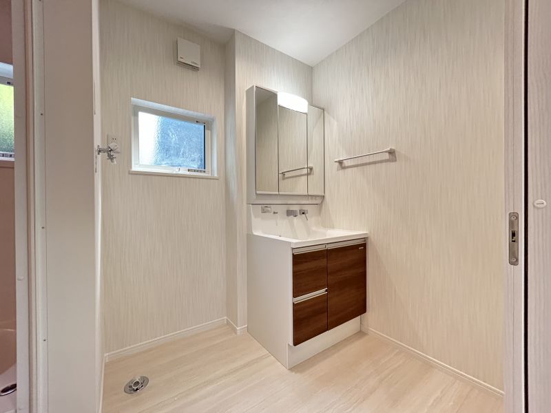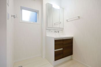 使いやすいシンプルなデザインの三面鏡洗面台。身支度時にうれしい機能性や収納力もしっかりと備えてます。