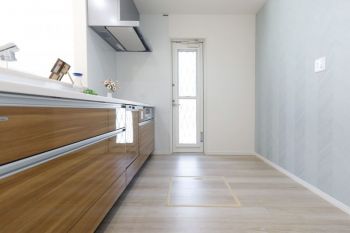 キッチン背面のエメラルドグリーンのアクセントクロスがお洒落です♪